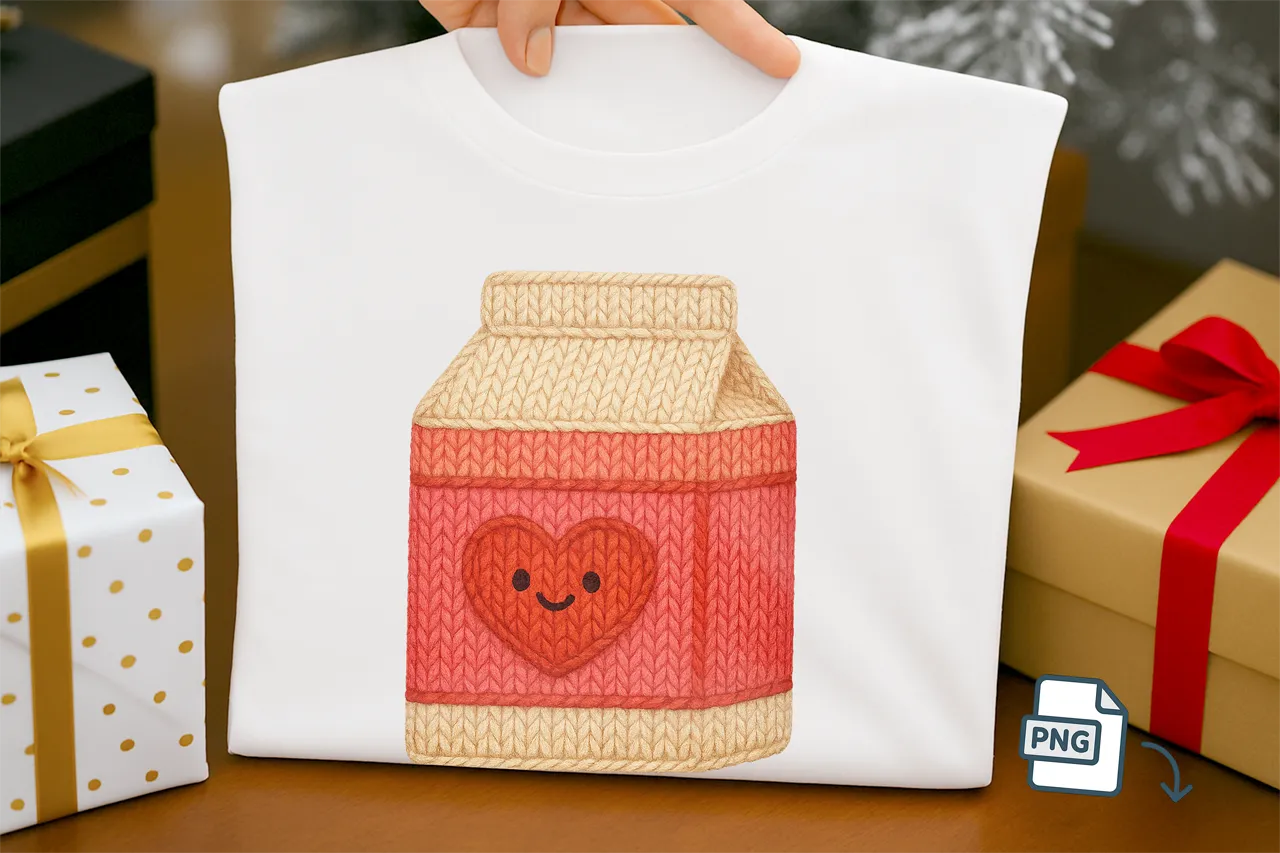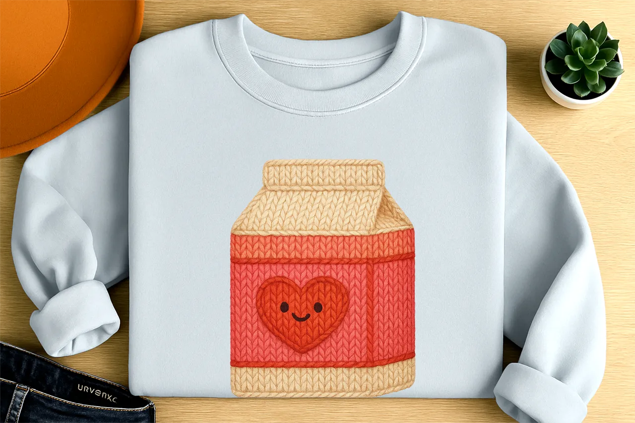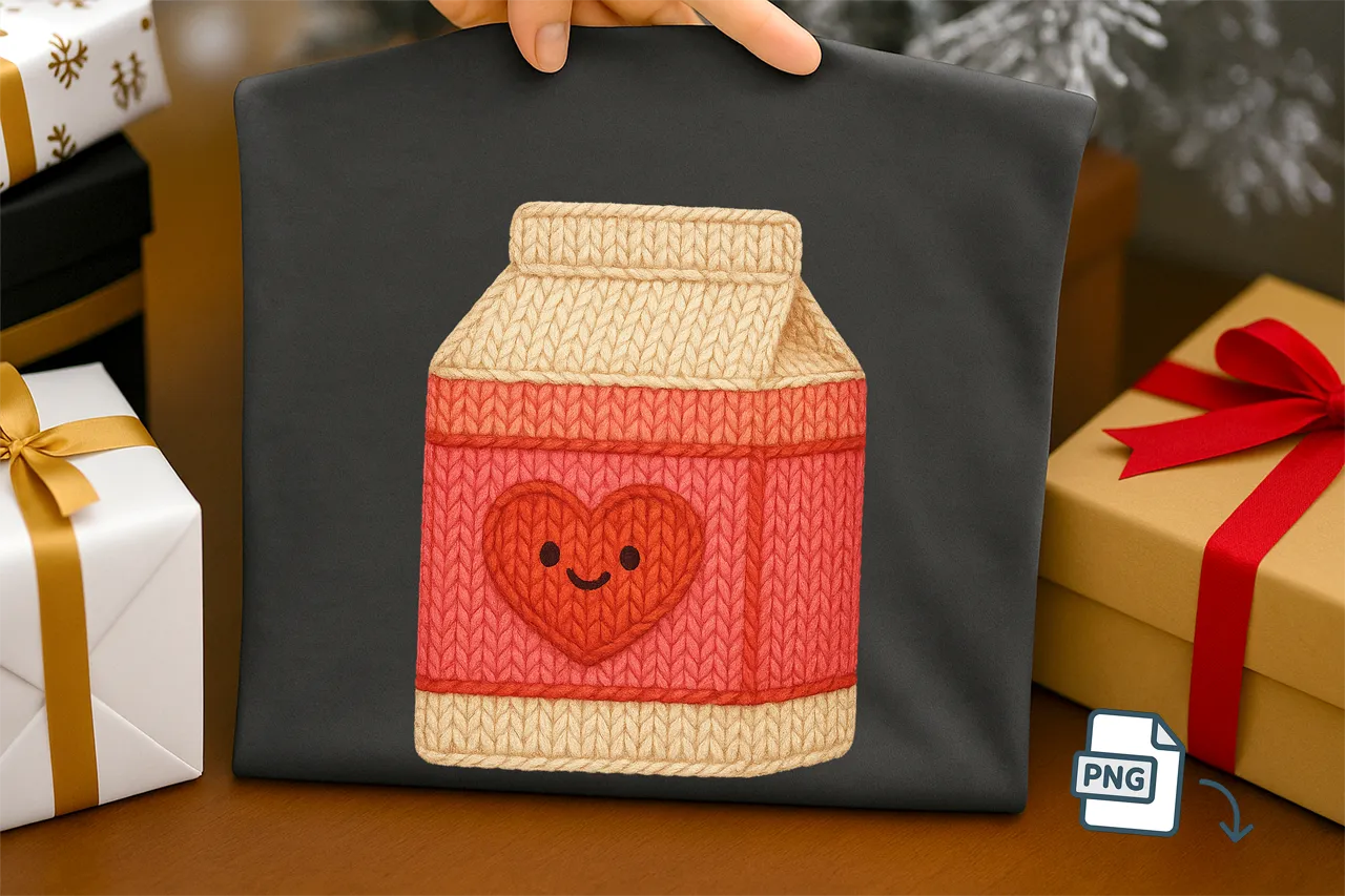 This premium-quality PNG design is created in a bold, original vector style—perfect for a wide variety of print and crafting projects. It features an adorable “Faux Crochet” illustration of a strawberry milk carton in pink and cream yarn textures. The carton is decorated with a large, smiling red knit heart, adding a sweet and playful touch. The detailed 3D yarn texture effect gives the appearance of handmade amigurumi without the bulk, making this design a unique and cozy choice for Valentine’s Day apparel, mugs, and romantic gifts for fans of kawaii aesthetics. Delivered as a 3600 x 3600 pixel (300 DPI) file with a transparent background, it’s ready for direct use on garments, accessories, and more.